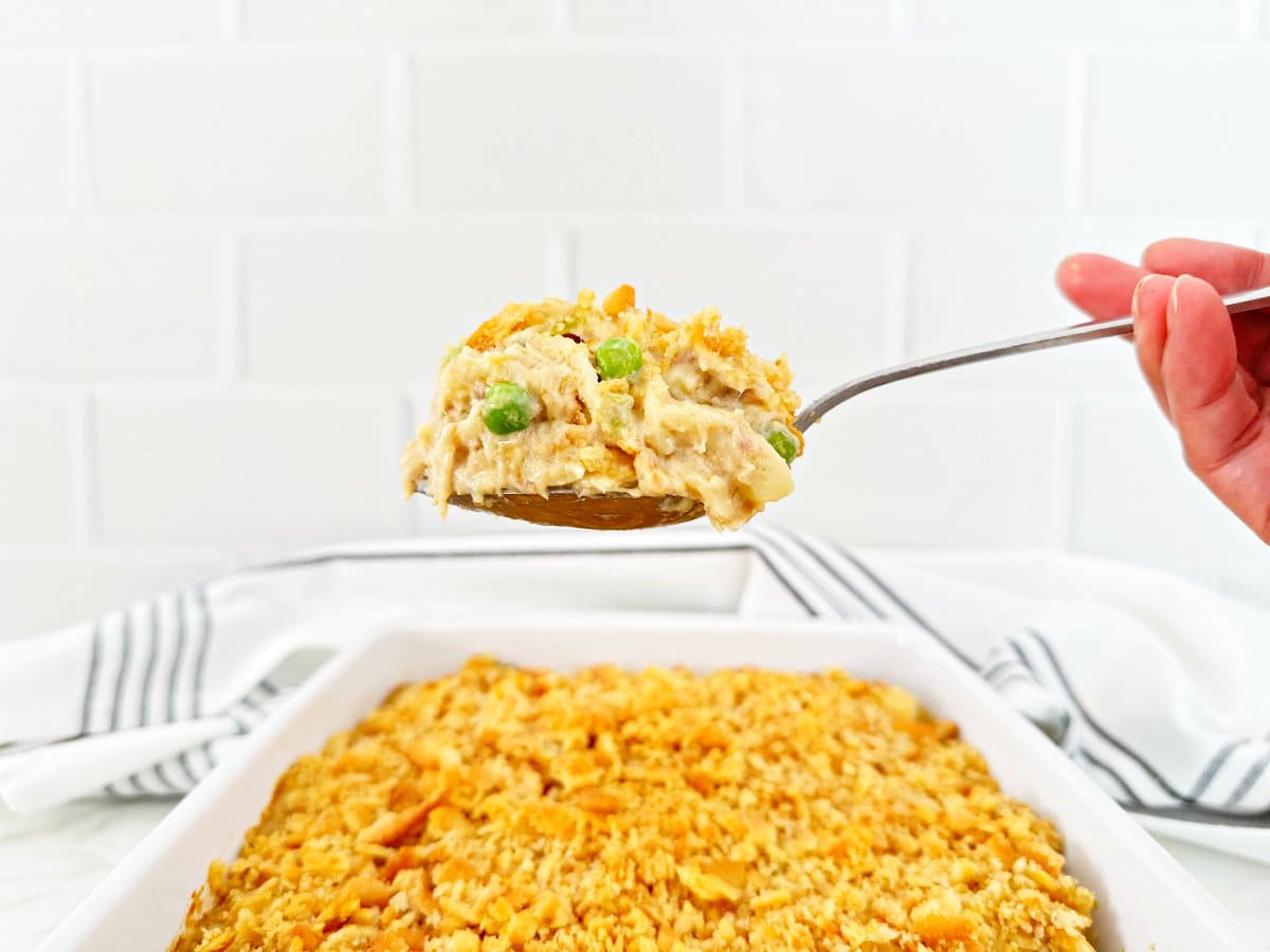 This is the ultimate tuna noodle casserole made from scratch with no canned soup. It has savory tuna, egg noodles, creamy cheesy sauce, sweet peas, and a buttery ritz cracker topping.